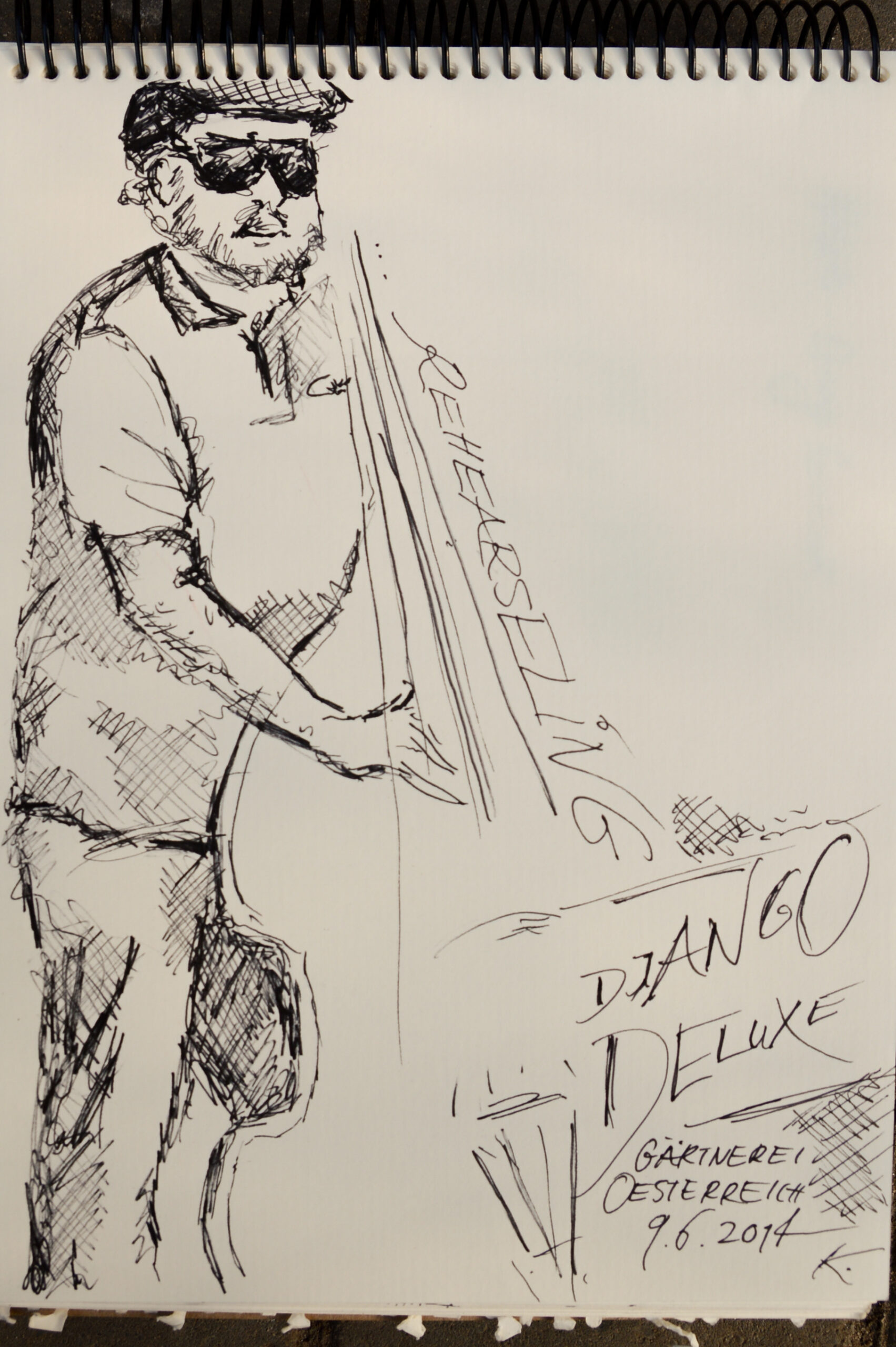 Und hier kommen auch meine Zeichnungen vom gestrigen Kreativtag in der Gärtnerei Oesterreich: Beim 1. Workshop der Kleinen Sommerkunst durften wir schon der Probe der Hamburger Jazzer „Django Deluxe“ lauschen. Das Konzert selbst hat erst unsere Finger und dann auch unsere Beine erzittern lassen! Bald spielen die Wilhelmsburger mit der NDR Bigband und der Sängerin Ayo.