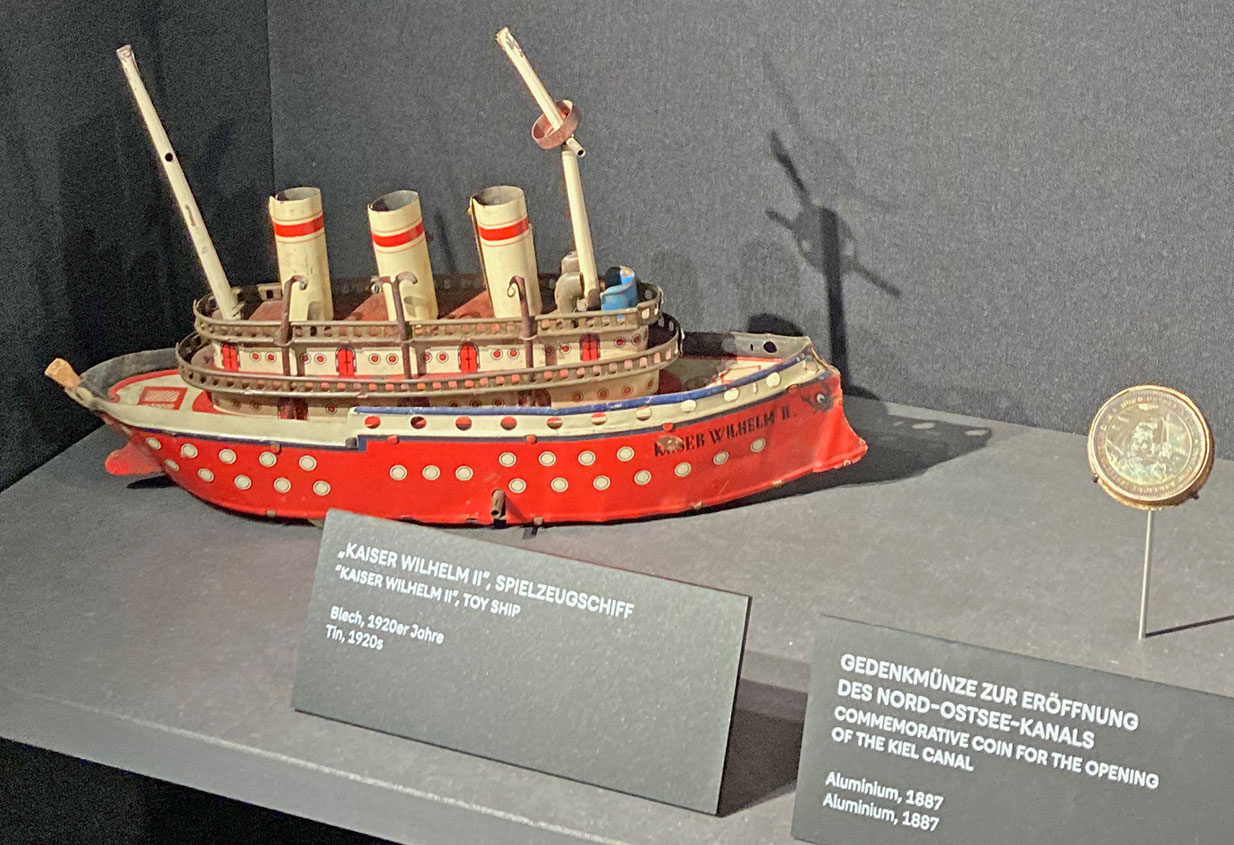 Mir hatte es im Museum ein Blech-Spielzeugschiff in einer Glasvitrine angetan, die Kaiser Wilhelm. Ich hatte es schon einmal ganz zu Beginn der Dithmarscher Zeichnertreffen gezeichnet und fand es irgendwie symbolträchtig, es jetzt noch einmal zu zeichnen.